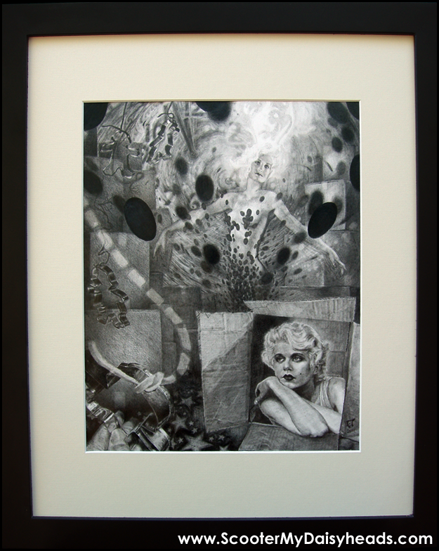 A glow has been added (around the platinum blonde's hair). Jeez, I remembered all of this stuff while I was drawing... I think the photo was an actress from the 30s named Jean Harlowe (pre-Marilyn Monroe). I liked the formulaic styling of her look. You can tell that in her time she was very hot and you can tell that she is from another time. I'm not saying that she her looks aren't STILL awesome, feminine, etc. ...I'm just saying that she's (also) ...very dated and THAT is one of the many, many, many things that work here (on a symbolic level).